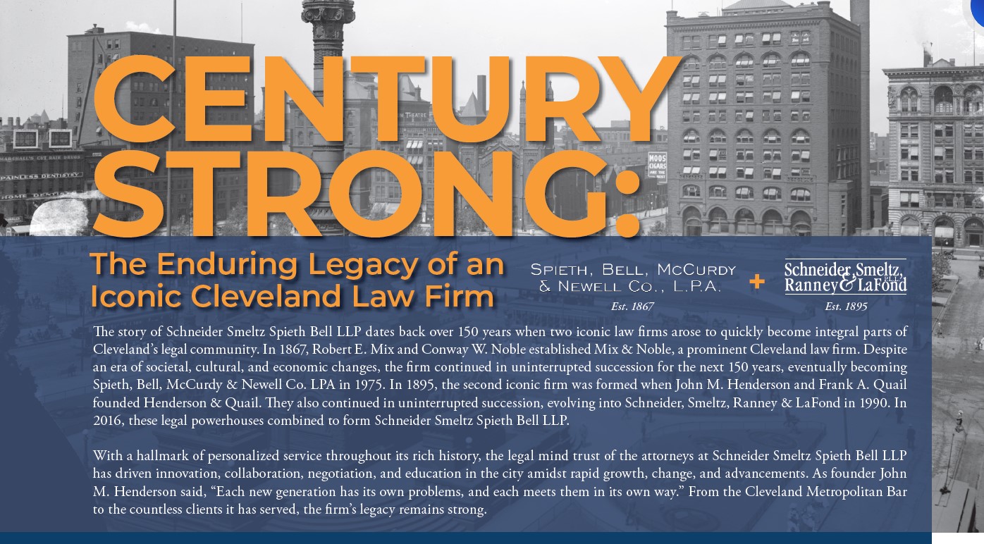 In 2016 Both Schneider, Smeltz, Ranney & LaFond LLP and Spieth, Bell, McCurdy & Newell Co., L.P.A. combined to form Schneider Smeltz Spieth Bell LLP, continuing our rich heritage of practicing law since the mid 1800's in Cleveland, Ohio. For the next nine years, the firm garnered the reputation of delivering excellent client service by providing forward-thinking, creative solutions to complex legal problems. Focusing on the practice areas of business law, family law, litigation, real estate, taxation, and trusts and estates.